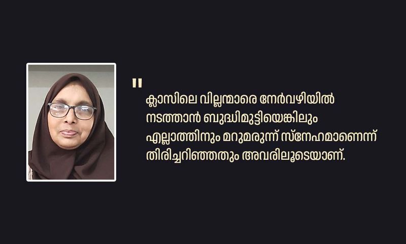 എന്റെ വിഷയം സോഷ്യല് സയന്സ് ആയതിനാല് ചുറ്റിലുമുള്ള എല്ലാ ജീവിതങ്ങളും എന്റെ ക്ലാസ് മുറിയില് ചര്ച്ചാ വിഷയമായി മാറിയിരുന്നു. പല വില്ലന്മാരെയും നേര്വഴിയില് കൊണ്ടുപോവാന് ബുദ്ധിമുട്ടായിരുന്നെങ്കിലും എല്ലാത്തിനുമുള്ള മറുമരുന്ന് സ്നേഹമാണെന്ന് ഞാന് തിരിച്ചറിഞ്ഞതും അവരിലൂടെ തന്നെയാണ്.